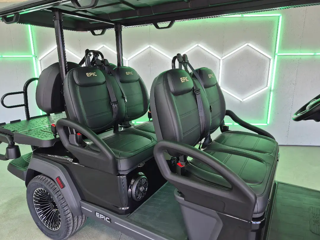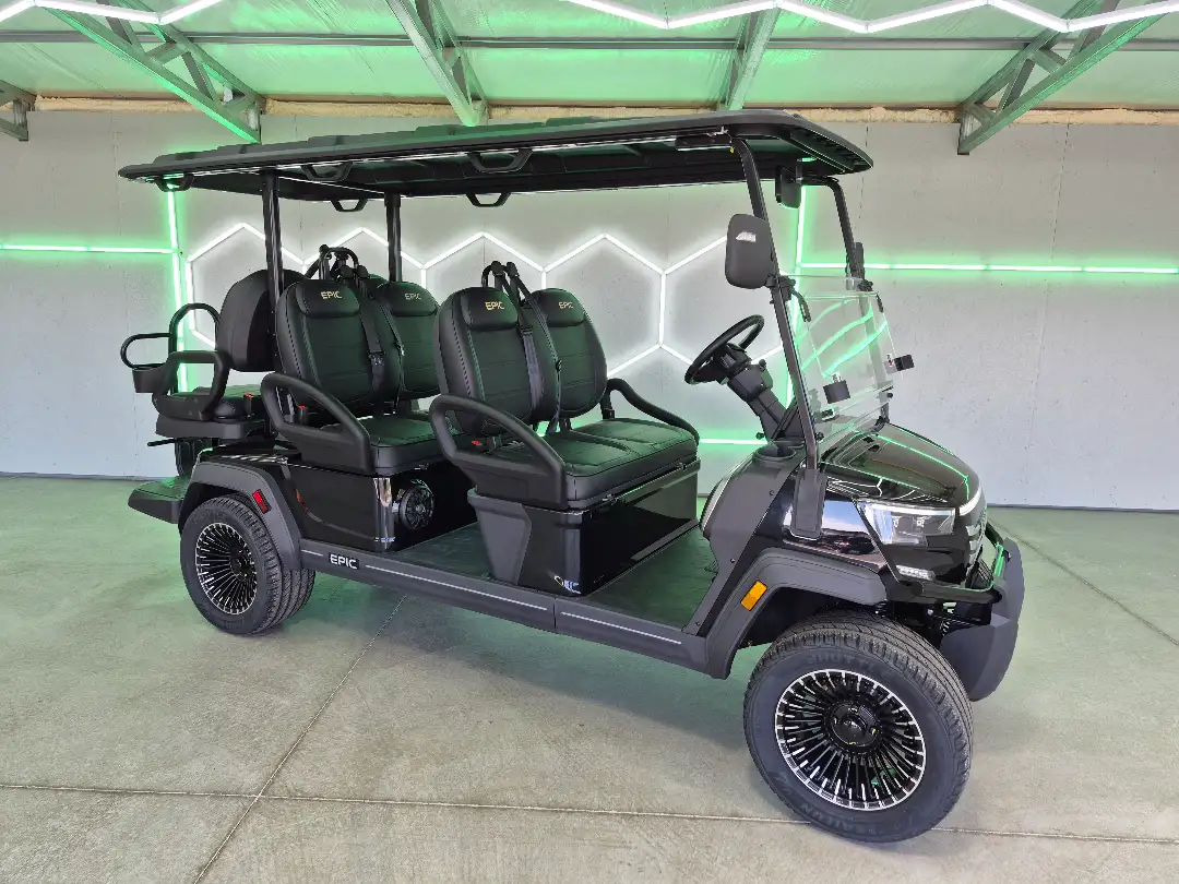 Introducing the all-new 2026 Epic E60FX, a lithium-powered golf cart replete with cutting-edge technology and luxurious features. Highlights include a powerful 6.3kW AC motor and a sophisticated 10.1” digital display screen.