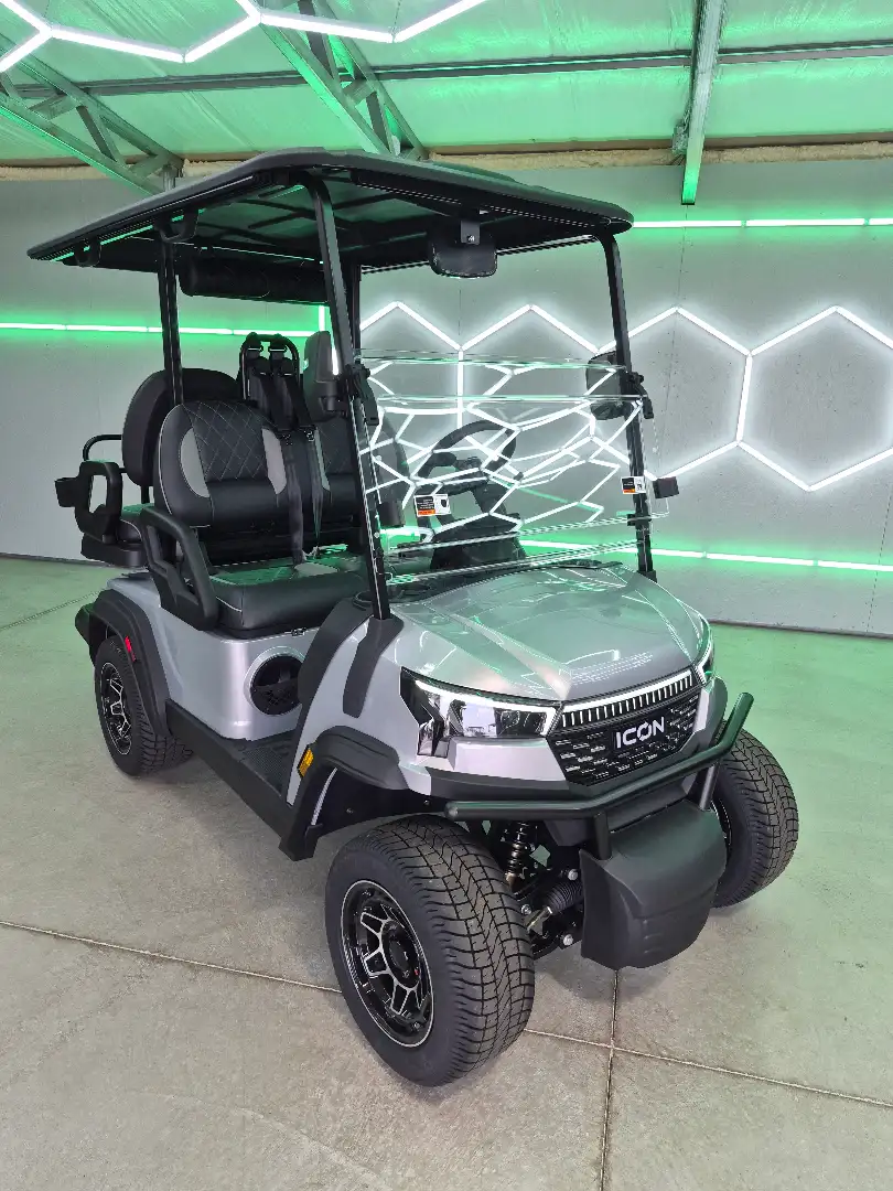 The 2026 Icon EV i40X is a robust golf cart featuring a powerful 48V ICON 5kW motor and a 51V/105Ah lithium battery, ensuring exceptional performance and reliability.